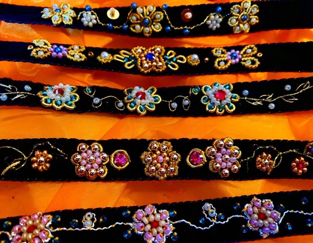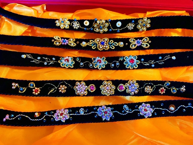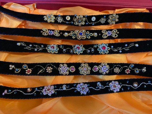 In liebevoller Handarbeit fertige ich gestickte Kropfbänder mit echt vergoldeter und versilberter Bouillon in traditioneller Goldstickerei, verziert mit Strasssteinen und Perlen, an.